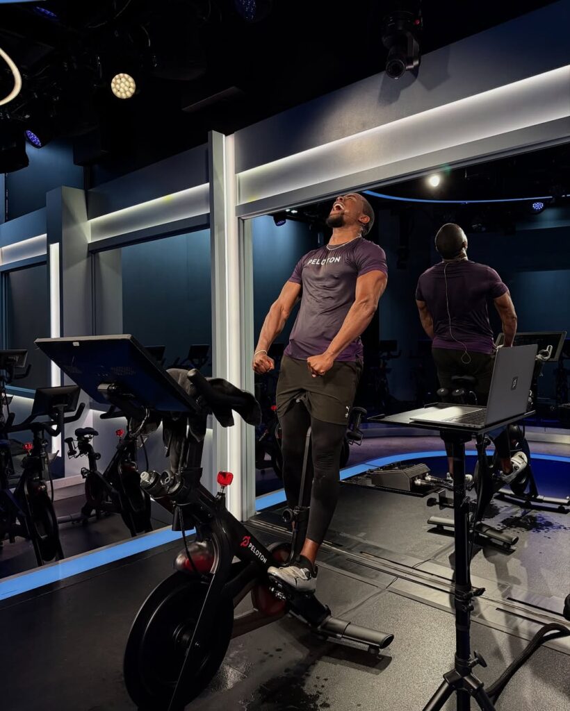 The trademark intensity that Peloton members will know hasn’t dimmed a bit. Some trainers cultivate a relaxed, almost meditative atmosphere in their classes. Not Toussaint. The 33-year-old is all about the energy. He’s a hype man who will constantly push you to show up and work harder. If you don’t want someone constantly in your ear holding you accountable, Toussaint’s classes probably aren’t right for you. And you better believe he holds himself to the same standards. Case in point, that 45-minute ride is Toussaint’s second workout of the day, and today is a slow day for him.