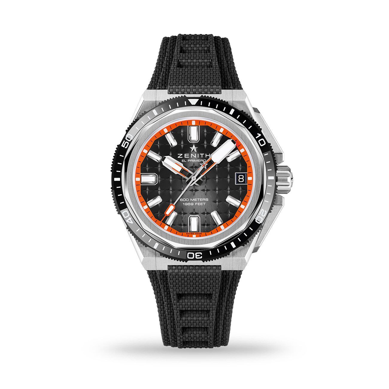 Zenith’s Defy Extreme series is all about pushing boundaries. While the brand is renowned for its mastery of the air, it’s just as capable in the sea. As you would expect from a dive watch, the Defy Extreme Diver has 600 metres of water resistance. That will hold up at depths of up to 1,969 feet, a nod to the original Zenith Defy Diver, which was released in 1969. The immense practical applications of the watch do not result in a compromise on style though. A 42.5mm titanium case with an angular design and vertically brushed strokes, as well as a ceramic outer bezel, maintain the watch’s sophisticated appearance.