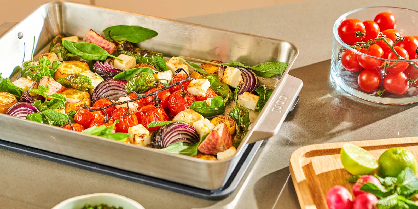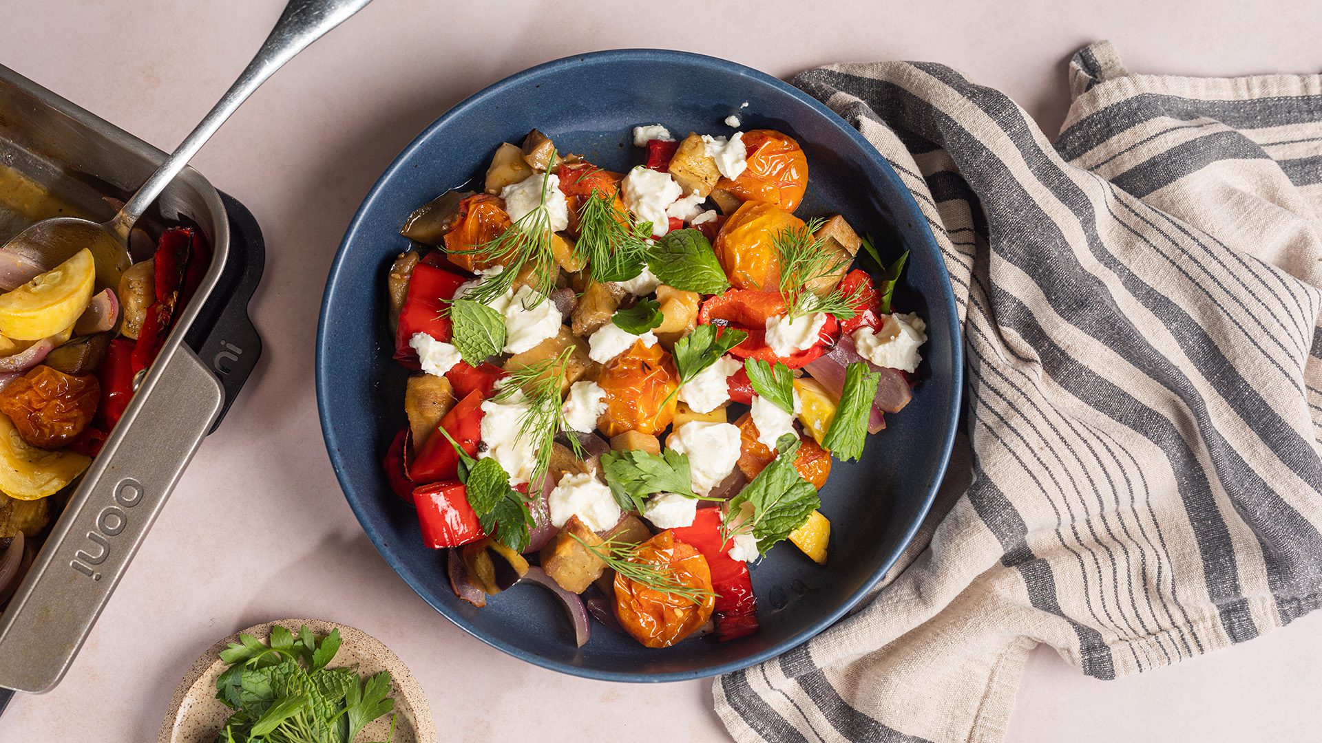 - Remove the pan from the oven. Season vegetables with lemon juice, then top with the feta and fresh herbs.
