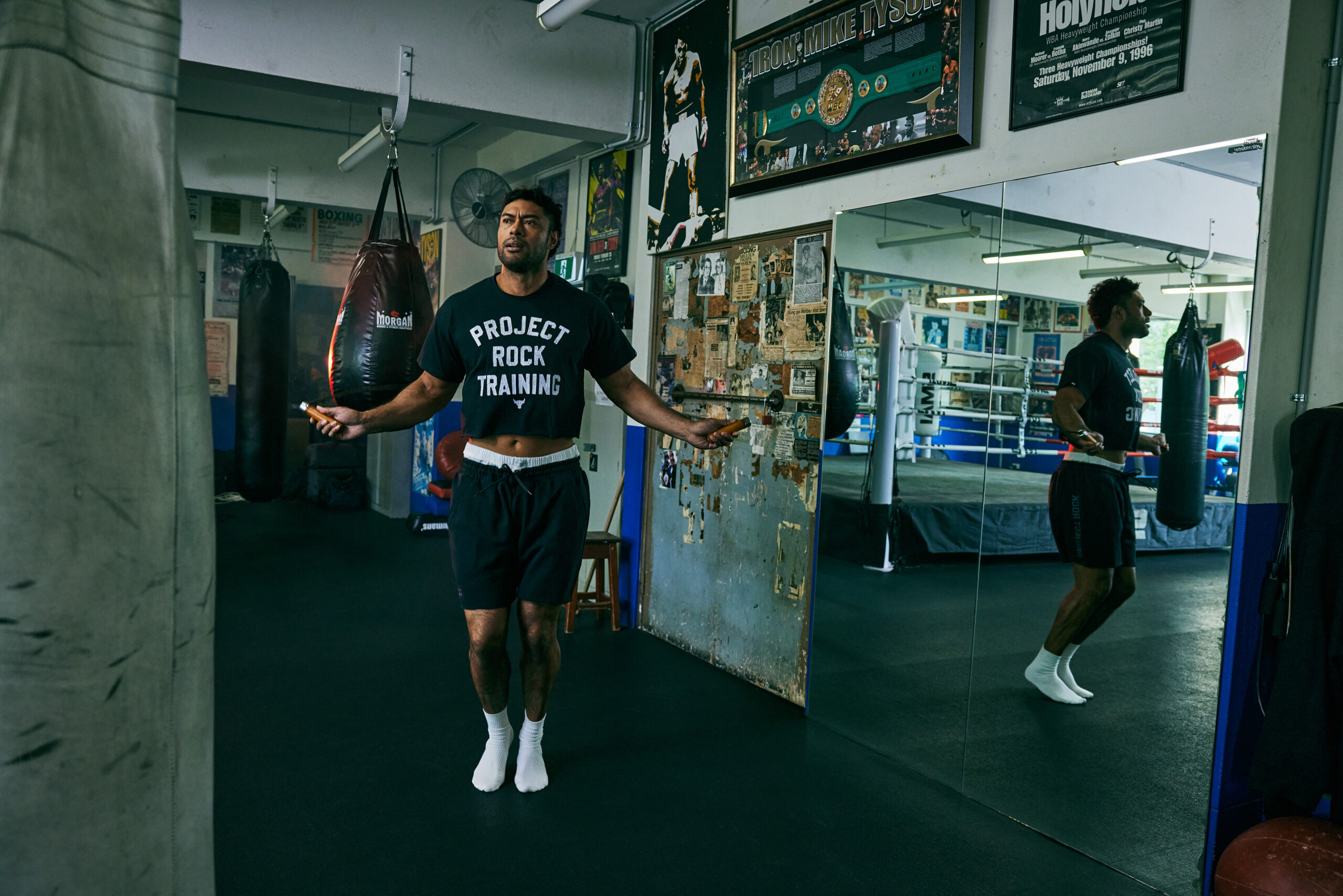 I’m reminded of the scene as Uli Latukefu, a man of similar build and power to the young Foreman, metes out punishment to a bag at Woolloomooloo PCYC in Sydney’s inner east. Each of Latukefu’s thunderous blows echoes around the gritty old school gym, as the bag swings as if on a pendulum. Cast amid ancient fight posters that are peeling off the walls, it’s if the greats of the sweet science—Tyson, Roy Jones Jnr., Lennox Lewis and Ali himself—are looking on.