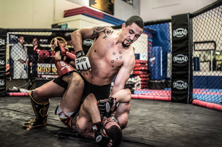Outside the cage, on the padded mats of the PMA Gym in Sydney’s south-west, a collection of primary-school kids are tapping away at punching bags. There’s chatter and bursts of laughter. But inside the octagon it’s serious business. The men’s faces drip with sweat. Blood is flowing from Robert Whittaker’s nose, turning his beard a rusty colour. His sparring partner, David Francis, has a gash under his left eye – the result of a Whittaker knee in the first round. The skin around the gash is raw and purple.