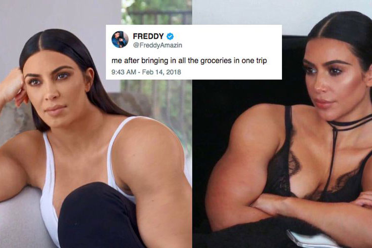Gym Kardashian features regular Kim in regular Kim photos — but with the addition of hulking muscular arms. “I think I found my new hobby,” writes Twitter user Jay Paul George, who first created and posted the doctored photos of Kim on his account three days ago, quickly amassing 74,000 retweets and, of course, some Gym Kardashian memes.